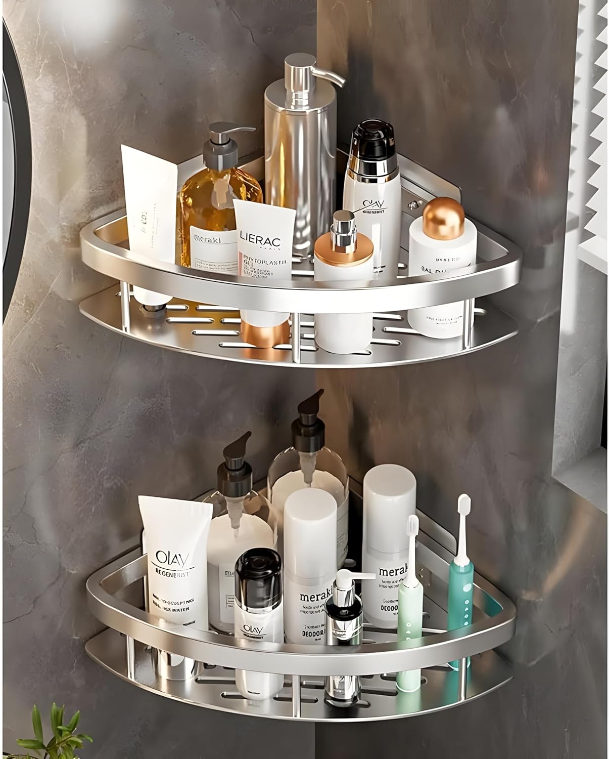 JIALTO Corner Shelf for Bathroom, Self Adhesive Aluminium Bathroom Shelf for Wall Mounted Bathroom Organizer and Bathroom Accessories 2 Pcs Silver Kitchen Organizer
