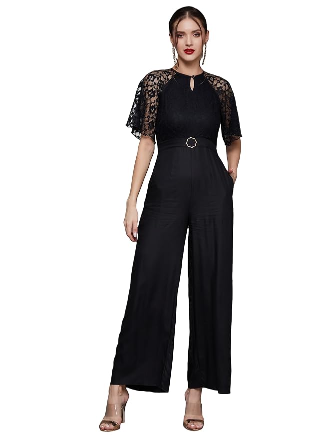 Miss Chase Women’s Round Neck Flared Sleeve Floral Regular Jumpsuit with Pockets
